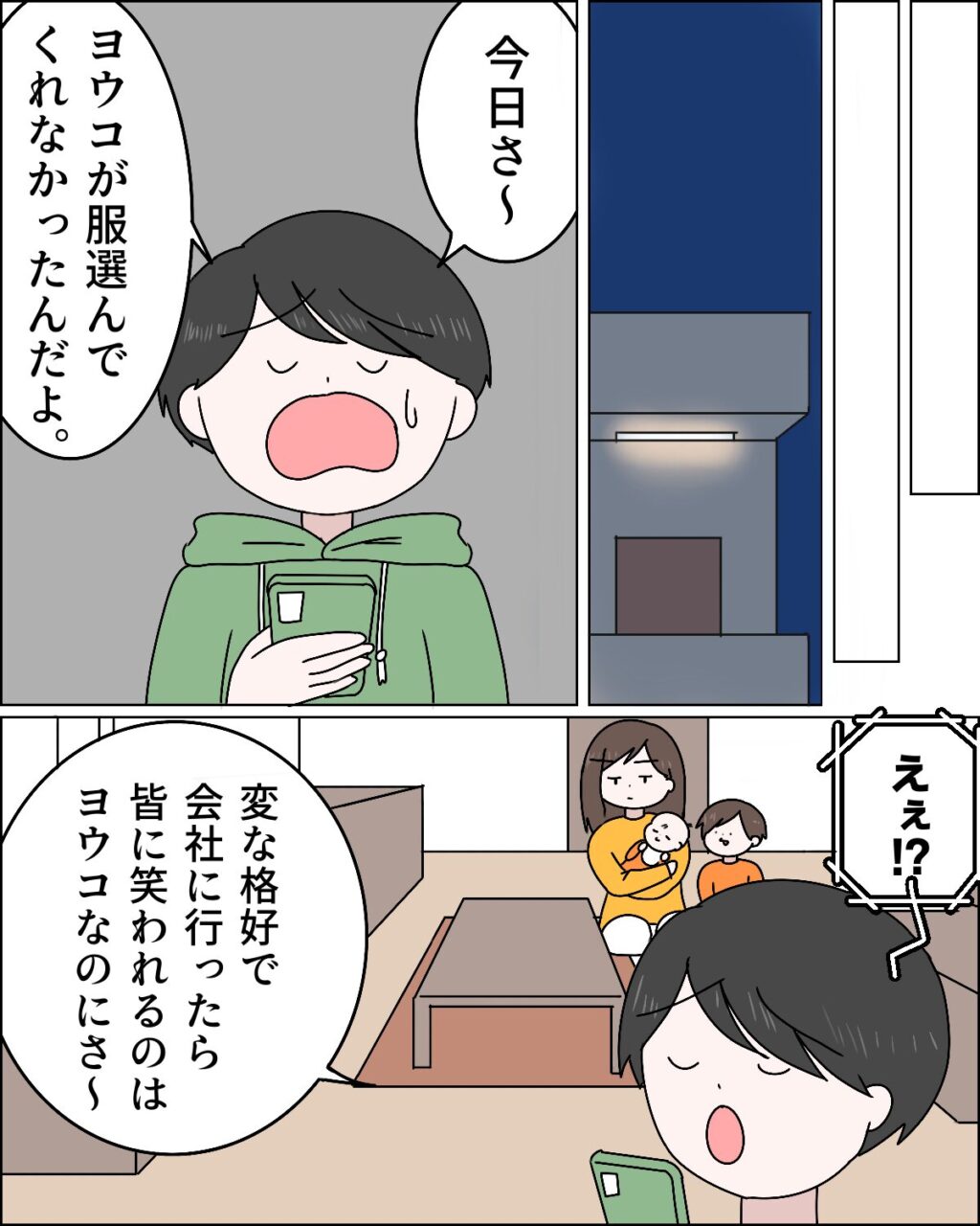 「今日さ~、ヨウコが服選んでくれなかったんだよ」とまた義母に電話して告げ口するマサオ。それを聞いて「えぇ!?」と驚く義母に、「変な恰好で会社に行ったら、みんなに笑われるのはヨウコなのにさ~」調子に乗ったマサオがそう言うと、