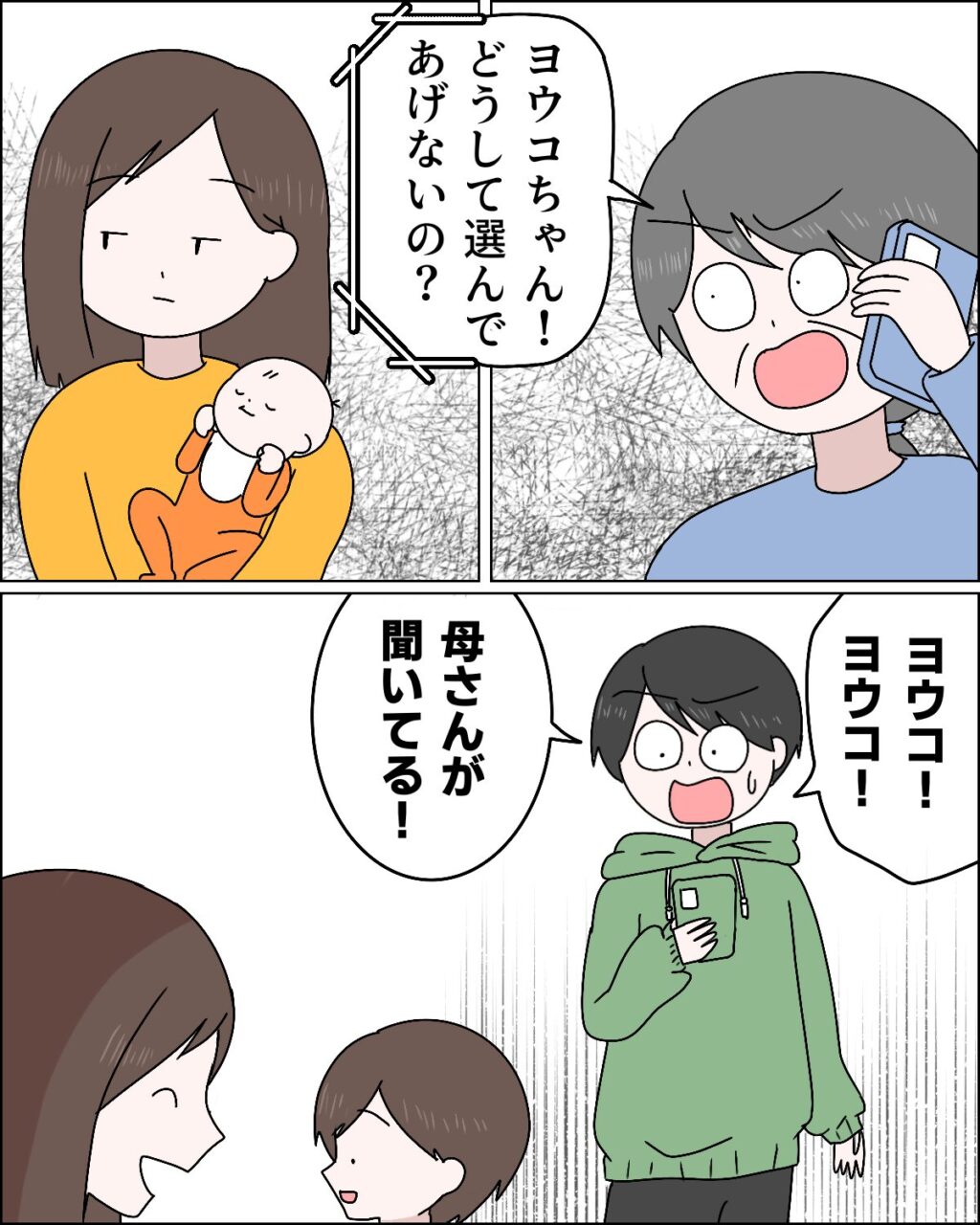 「ヨウコちゃん!どうして選んであげないの?」とスピーカー越しに義母が聞いてくるも、当然ながら無視。「ヨウコ!ヨウコ!母さんが聞いてる!」とマサオに返事を急かされ、