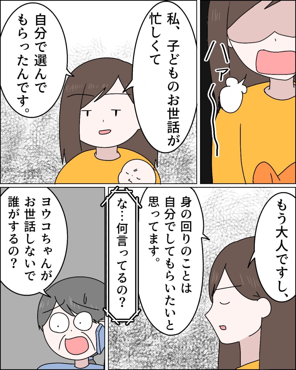 「ハァ~」と深いため息をついた私が、「私、子どものお世話が忙しくて、自分で選んでもらったんです。もう大人ですし、身の回りのことは自分でしてもらいたいと思ってます」と冷静に話すと、「な・・何言ってるの?」と驚いた義母が、「ヨウコちゃんがお世話しないで誰がするの?」と聞いてきたので、