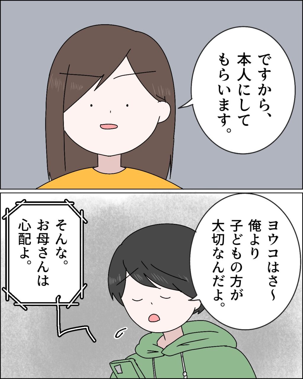 「ですから、本人にしてもらいます」と冷静に話すと、「ヨウコはさ~、俺より子どもの方が大切なんだよ」とマサオがまた義母に告げ口。「そんな。お母さんは心配よ」義母がすかさずマサオを庇うのを聞いて、