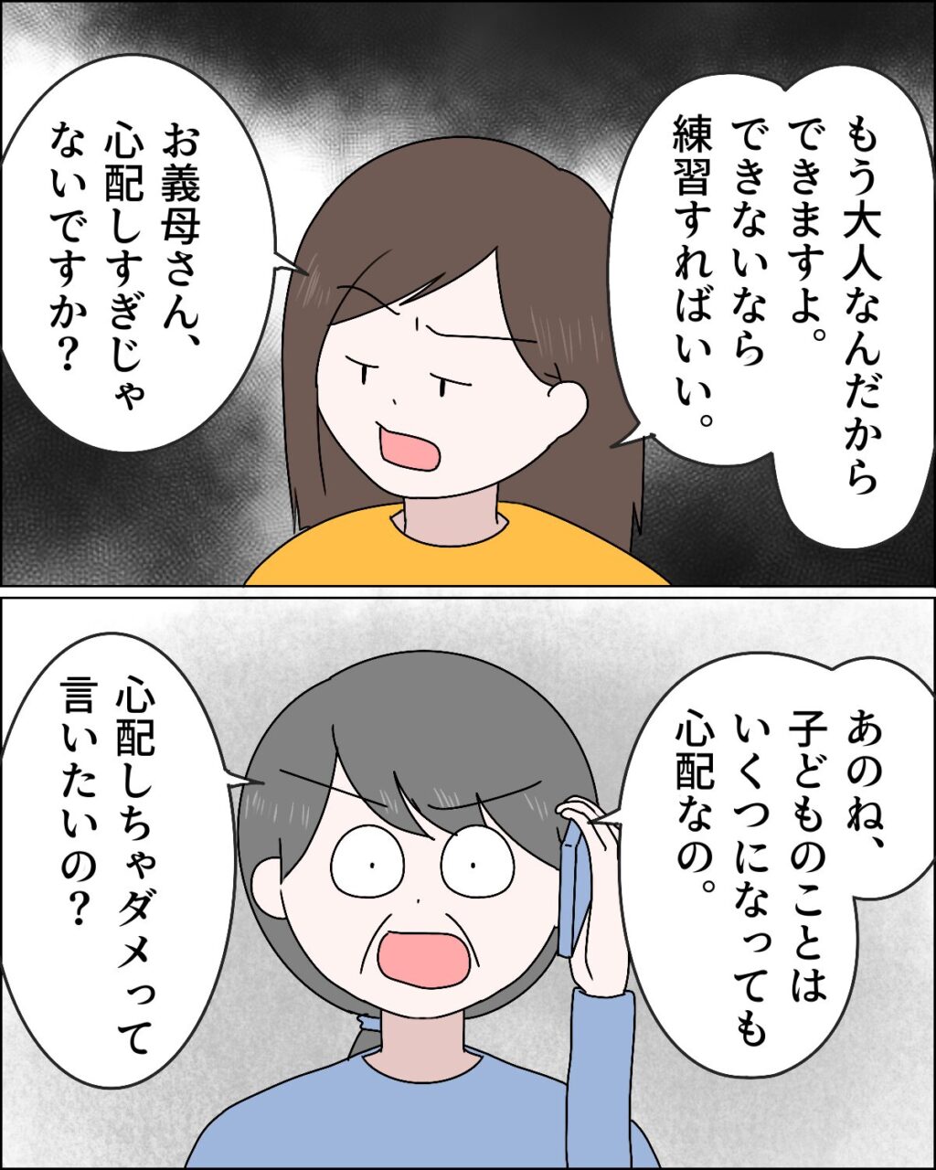 「もう大人なんだからできますよ。できないなら練習すればいい。お義母さん、心配しすぎじゃないですか?」私がそう言うと、「あのね、子どものことはいくつになっても心配なの。心配しちゃダメって言いたいの?」と私に食ってかかってくるのでした。