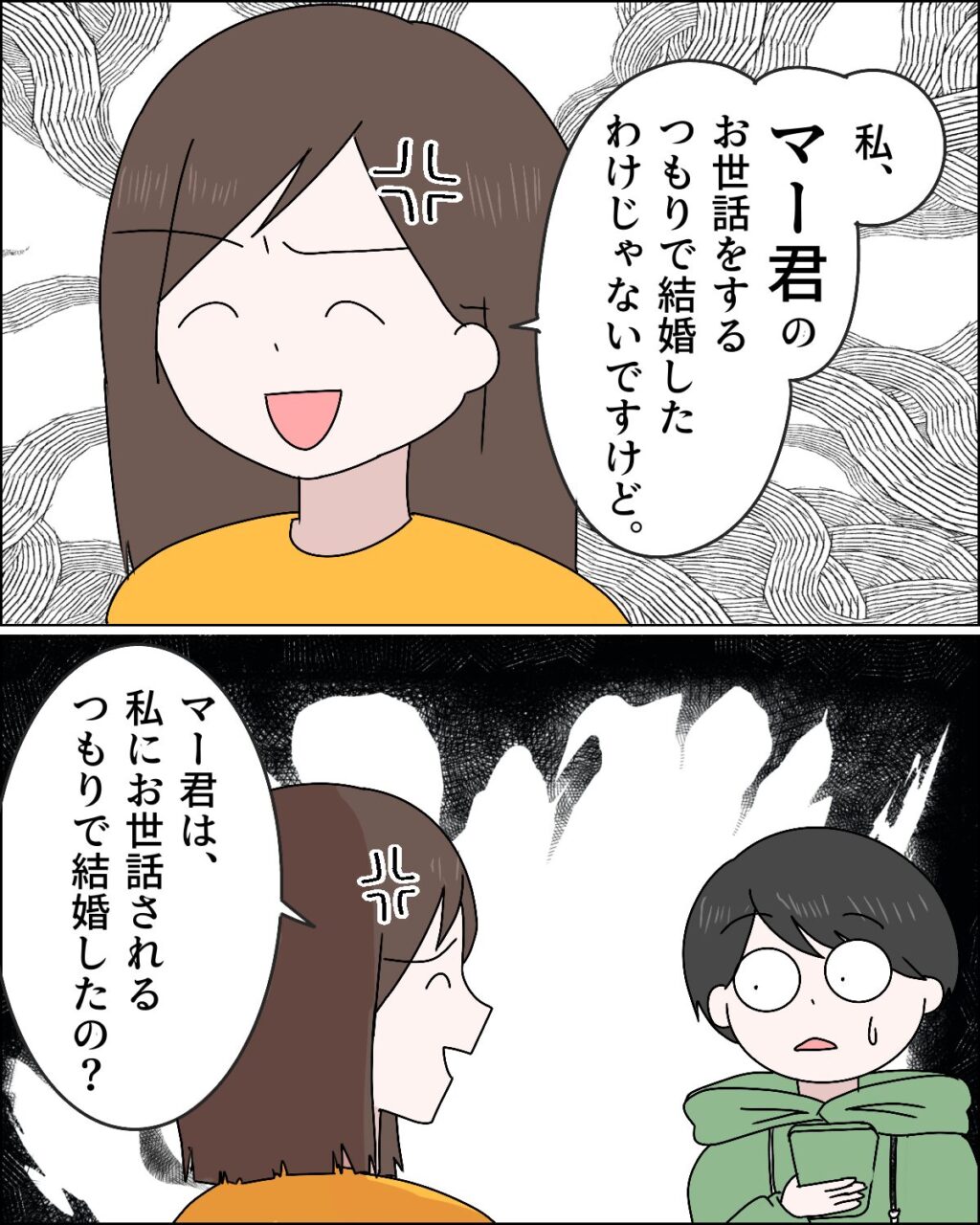私は、何度言っても分からない義母に「マー君のお世話をするつもりで結婚したわけじゃないですけど」と嫌味たっぷりに伝えます。そしてマサオに視線を移すと「マー君は私にお世話されるつもりで結婚したの?」と張り付いた笑顔で聞いてやりました。