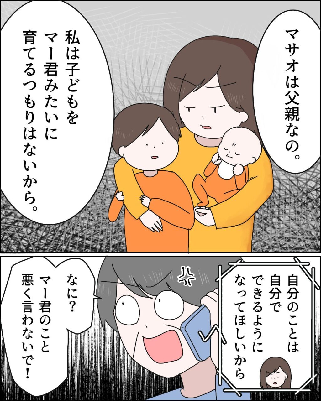 身の回りのことを全部やってもらおうとするマサオにうんざりした私は、髪を乾かすのも服を選ぶのも完全拒否。すると、そのことに不満を感じたのか、マサオは義母に電話で告げ口をし始めます。案の定、義母はマサオのお世話をしない私を責めましたが、私は一歩も引かず「もう大人ですし身の回りのことは自分でしてもらいます、お義母さんは心配し過ぎです」ときっぱり伝えました。