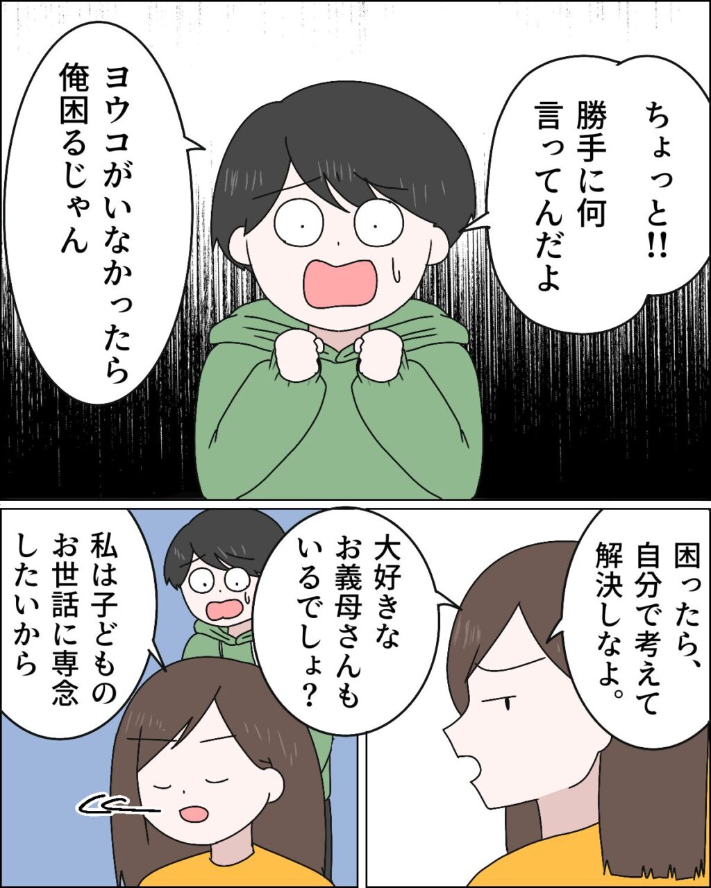 自分に断りもなくお世話を丸投げされたのが気に入らないのか、「ちょっと!勝手に何言ってんだよ、ヨウコがいなかったら俺困るじゃん」と慌てるマサオ。しかし、私はそんな彼に構うことなく「困ったら自分で考えて解決しなよ、大好きなお母さんもいるでしょ?」と冷たく突き放しました。