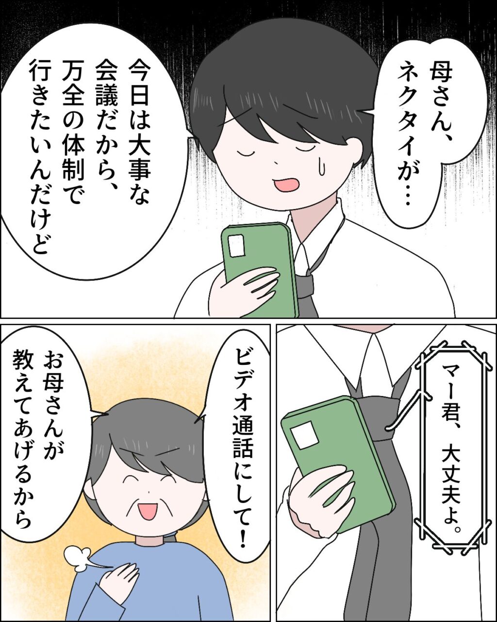 「母さん、ネクタイが・・・今日は大事な会議だから万全の体制で行きたいんだけど」マサオが困ったように言うと、義母は胸をドンと叩いて「マー君大丈夫よ、ビデオ通話にして!お母さんが教えてあげるから」と自信たっぷりに言いました。