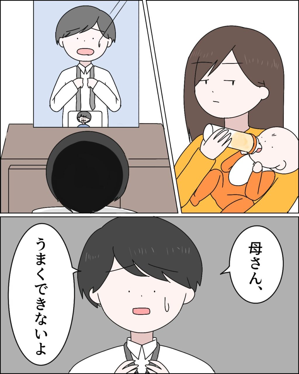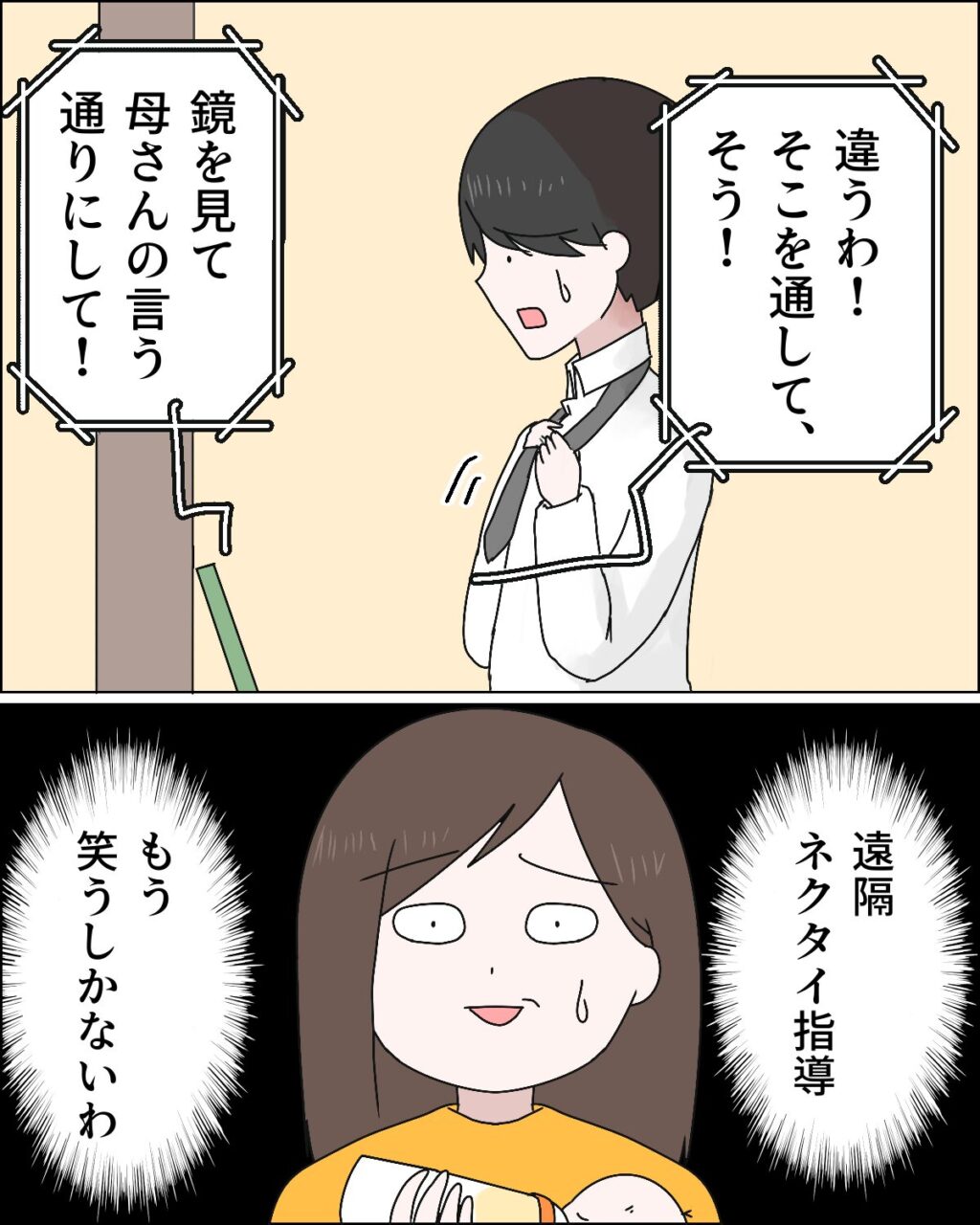 「違うわ!そこを通して、そう!鏡を見て母さんの言う通りにして!」いい歳した大人が、母親に遠隔でネクタイの結び方を教わるって・・・。義母の指示通りにあたふたとネクタイを結ぶマサオの姿を見て、私は笑うしかありませんでした。