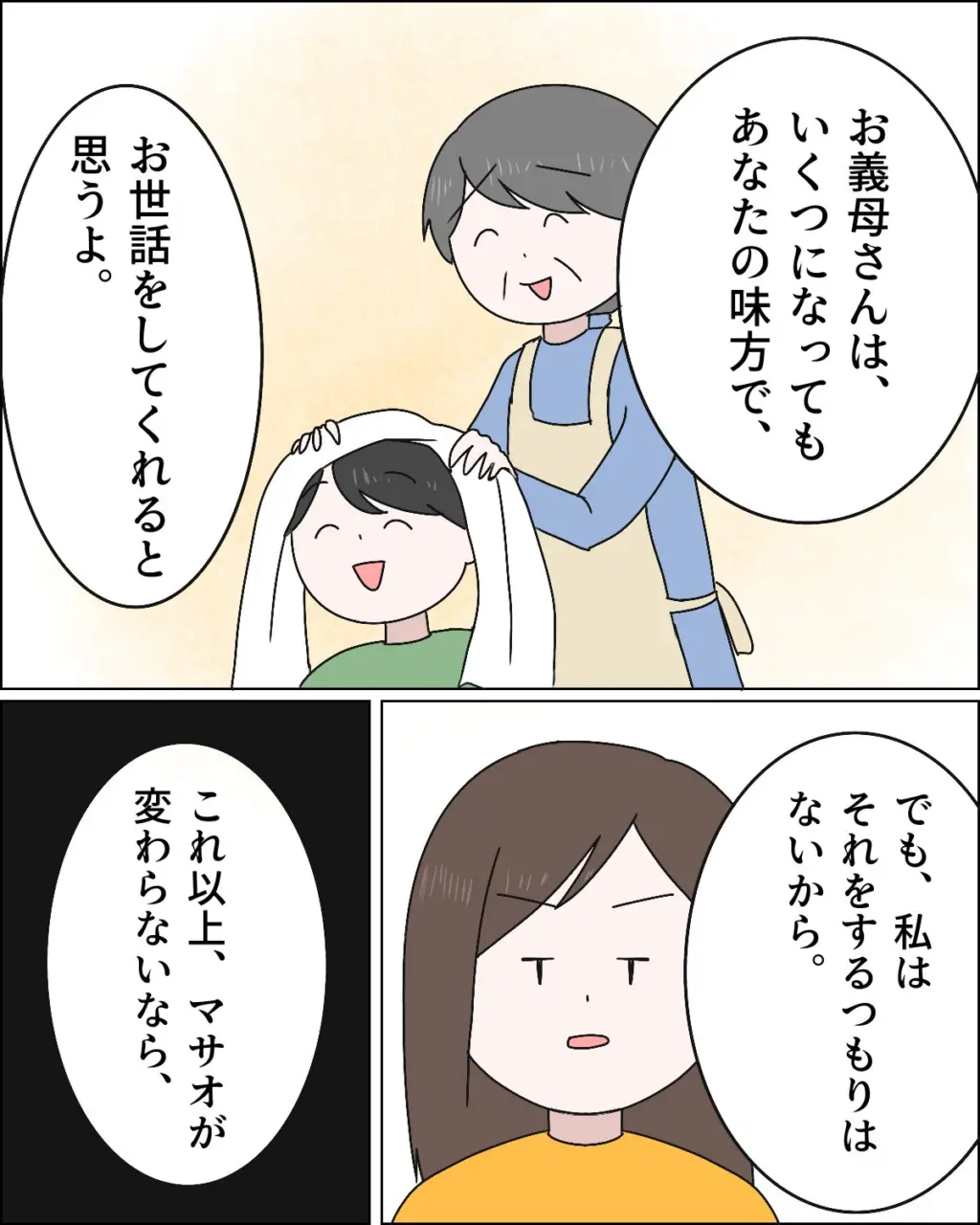 そして、「お義母さんは、いくつになってもあなたの味方で、お世話をしてくれると思うよ。でも、私はそれをするつもりはないから」そう言った後、「これ以上、マサオが変わらないなら、」