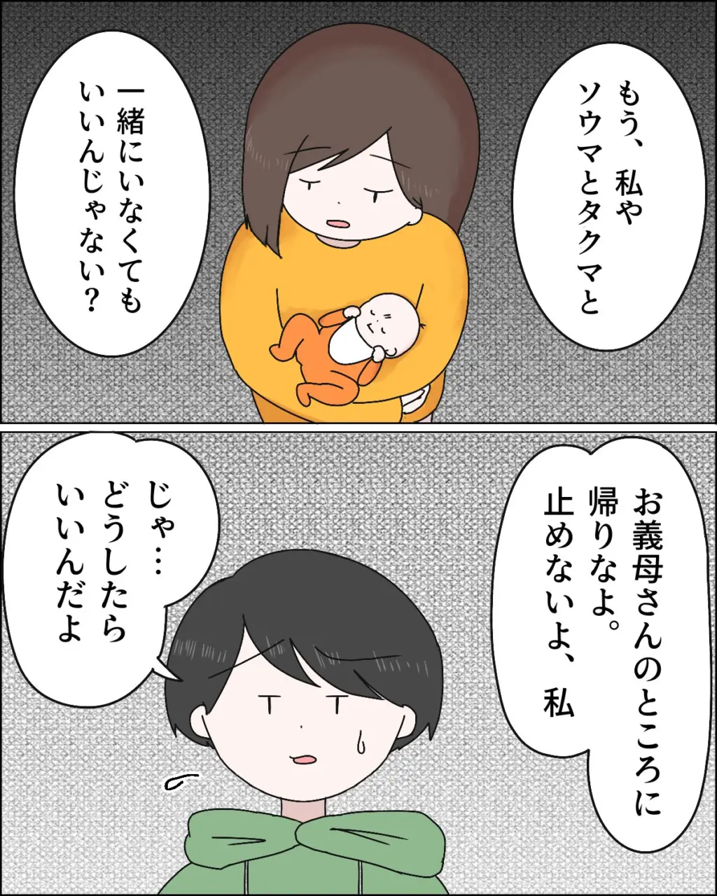 「もう、私やソウマとタクマと一緒にいなくてもいいんじゃない?お義母さんのところに帰りなよ。止めないよ、私」ヨウコさんがそう言うと、「じゃ・・どうしたらいいんだよ」と困ったように言うマサオさんに、