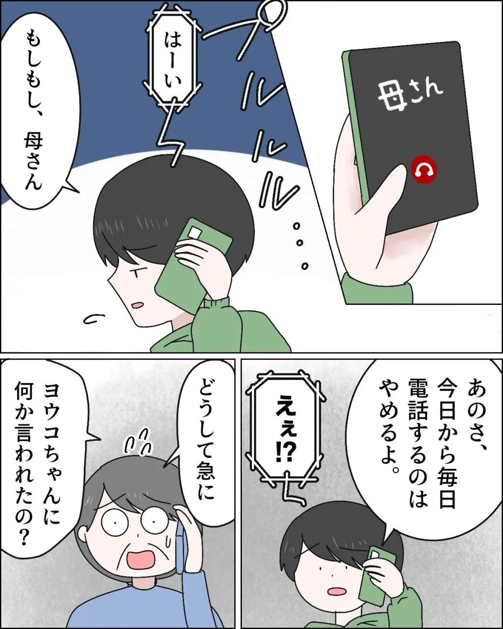 そしてすぐ義母に電話をすることに。「はーい」と電話に出た義母に、「もしもし、母さん。あのさ、今日から毎日電話するのはやめるよ」と切り出すと、「えぇ!?」と驚く声が。「どうして急に・・ヨウコちゃんに何か言われたの?」と突然のマサオさんの言葉に義母も驚いて聞き返しました。