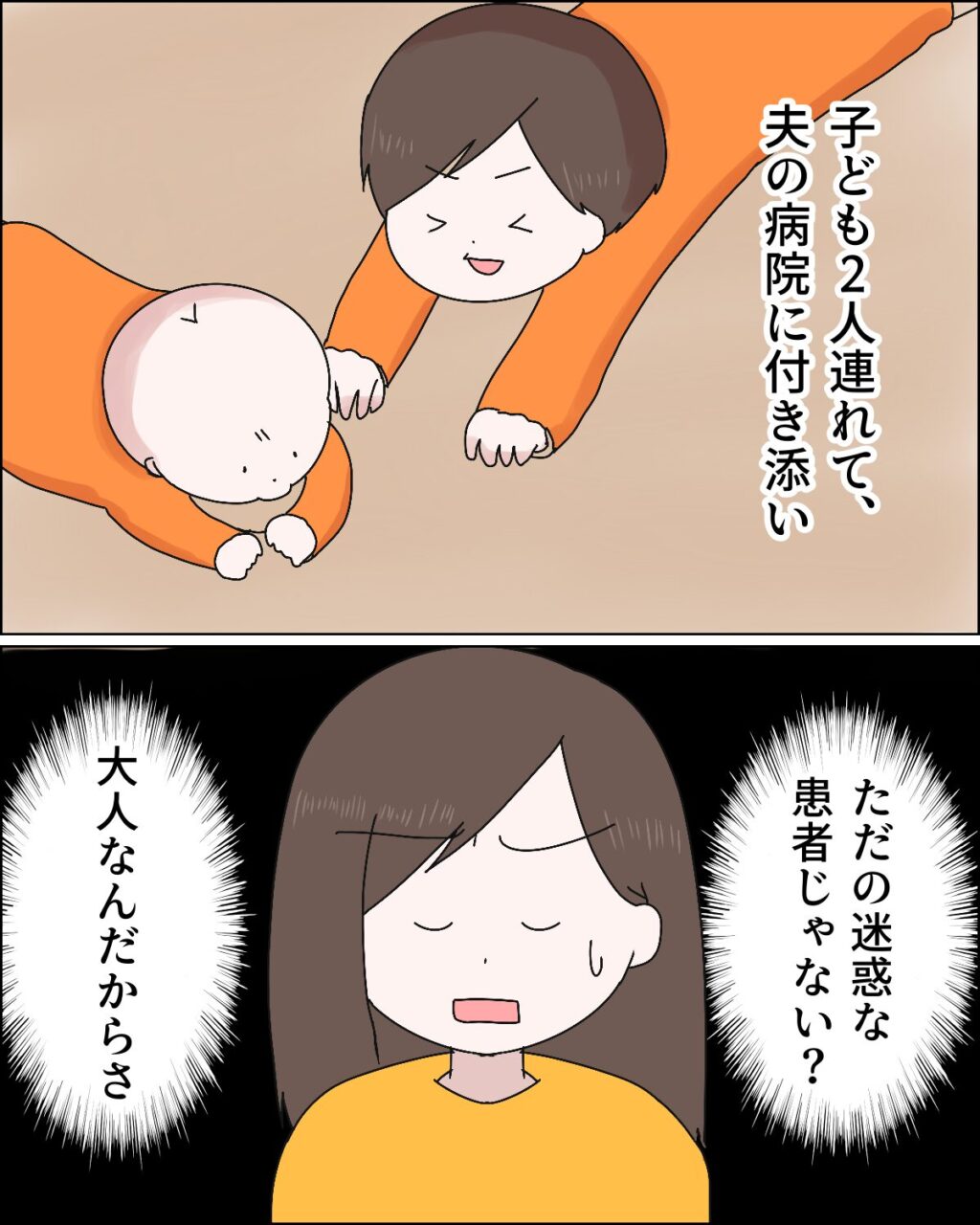 あまりにマサオが食い下がってくるので、私は頭の中で病院に付き添うシュミレーションをしてみました。3歳と1歳の子ども2人を連れて、夫の病院に付き添い・・。ただの迷惑な患者じゃない?大人なんだし、一人で動けないわけでもない。首の後ろがちょっと赤くなってるだけの元気な人間になぜわざわざ幼い子どもを連れて私が付き添わないといけないの?シュミレーションの結果、やはりどう考えても私が付き添う必要はないという結論に至りました。