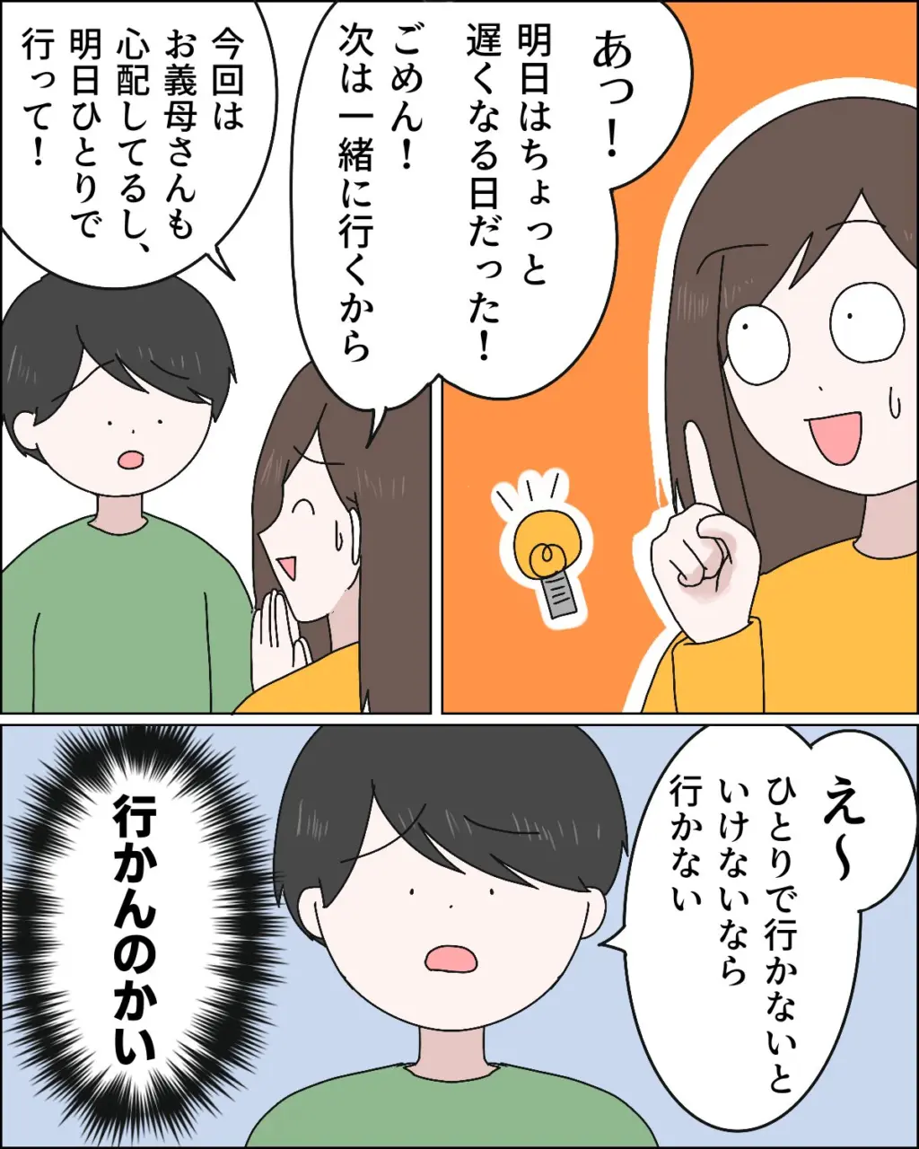 私は付き添いを回避するために「あっ!明日はちょっと遅くなる日だった!」と適当に理由を作り、「ごめん!次は一緒に行くから。今回はお義母さんも心配してるし、明日ひとりで行って!」と申し訳なさそうに伝えました。すると、「え~。ひとりで行かないといけないなら行かない」と子どものように駄々をこねるマサオ。そうくるか・・。私は心の中で「行かんのかい!」と激しく突っ込みました。