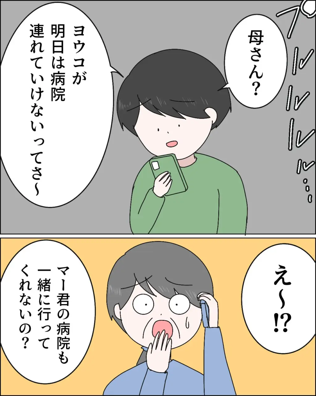 日課のスピーカー通話で、首の後ろに何かできたと心配そうに義母に相談していた夫のマサオ。子ども達のお世話でてんやわんやだった私は自分には関係ないと思って聞き流していたのですが、義母から「マー君を病院に連れて行ってもらえないかしら?」とまさかのお願いをされてしまいました。「仕事帰りに一人で行った方が早い気がする」とやんわり断るも、義母は「心配だから付き添って欲しい」と食い下がり、病院に行ったら結果を教えてと言って一方的に電話を切ってしまいました。マサオも「母さんが心配する」「母さんがヨウコと病院に行けって言ってた」「俺もヨウコがいた方が安心」と言って私に付き添いを求めてきました。