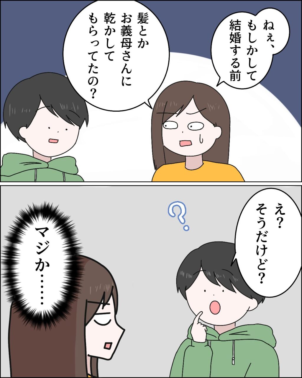 その後、「ねぇ、もしかして結婚する前、髪とかお義母さんに乾かしてもらってたの?」私がそう言うと、「え?そうだけど?」とさも当然と言わんばかりに肯定するマサオに「マジか・・」心の中で呟きました。