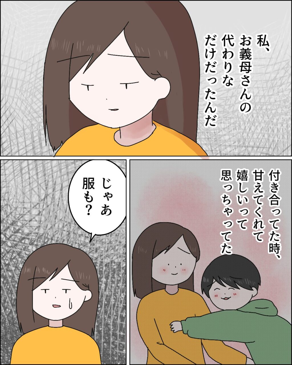 「私、お義母さんの代わりなだけだったんだ。付き合ってた時、甘えてくれて嬉しいって思っちゃってた」と過去を振り返り落ち込む私が、「じゃあ服も?」とたずねると、