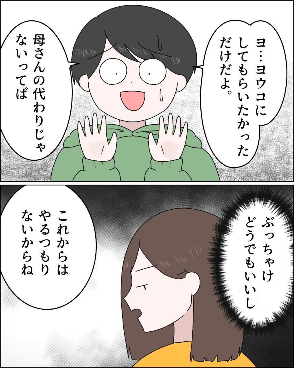 「ヨ、ヨウコにしてもらいたかっただけだよ。母さんの代わりじゃないってば」と慌てるマサオに、「これからはやるつもりないからね」と言いつつ、「ぶっちゃけどうでもいいし」と思っていました。