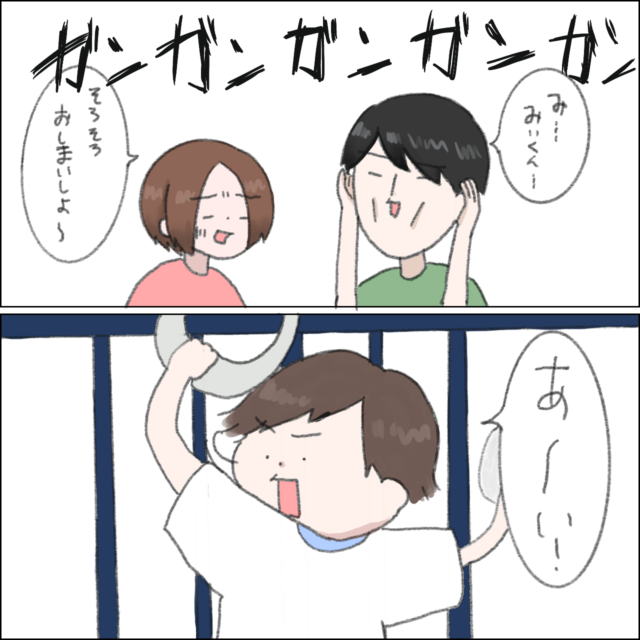 朝が苦手なママ、パパとは対照的にシャキッと目覚めるみぃくん。なかなか起きないでいると、布団用の大きな洗濯ばさみを手に持ちゲートをガンガン叩いてみぃくんの演奏会が始まります。