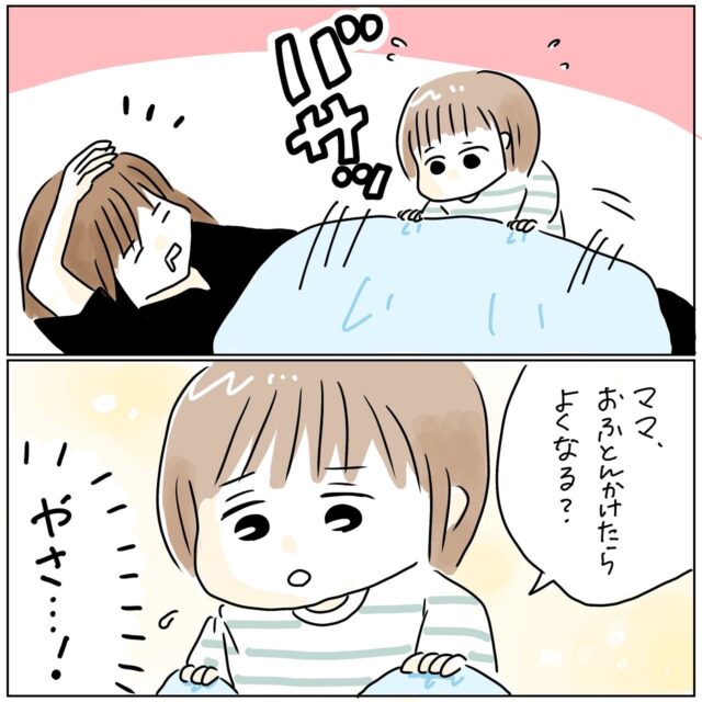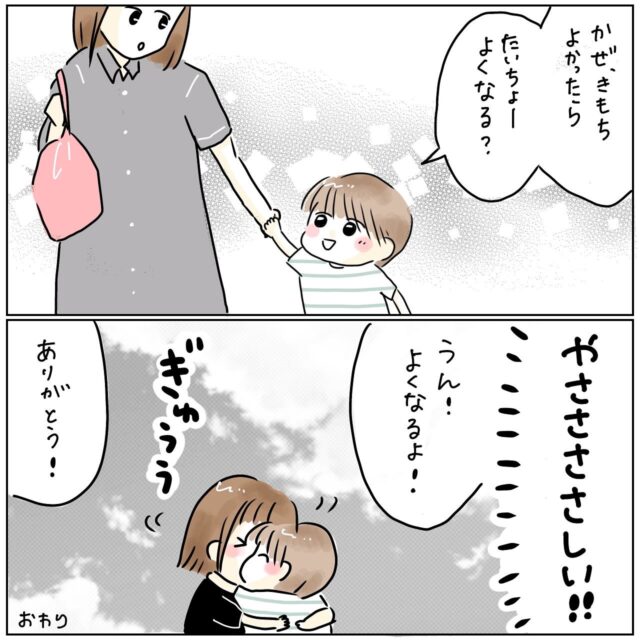 3歳の男の子あーちゃんのママであるホッターさんから、優しいあーちゃんのお話です。ホッターさんの体調が悪かった日、辛そうなホッターさんを見たあーちゃんは・・・。