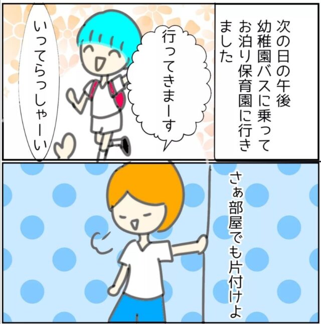 幼稚園バスに乗って笑顔でお泊まり保育に行った長男を見送り、