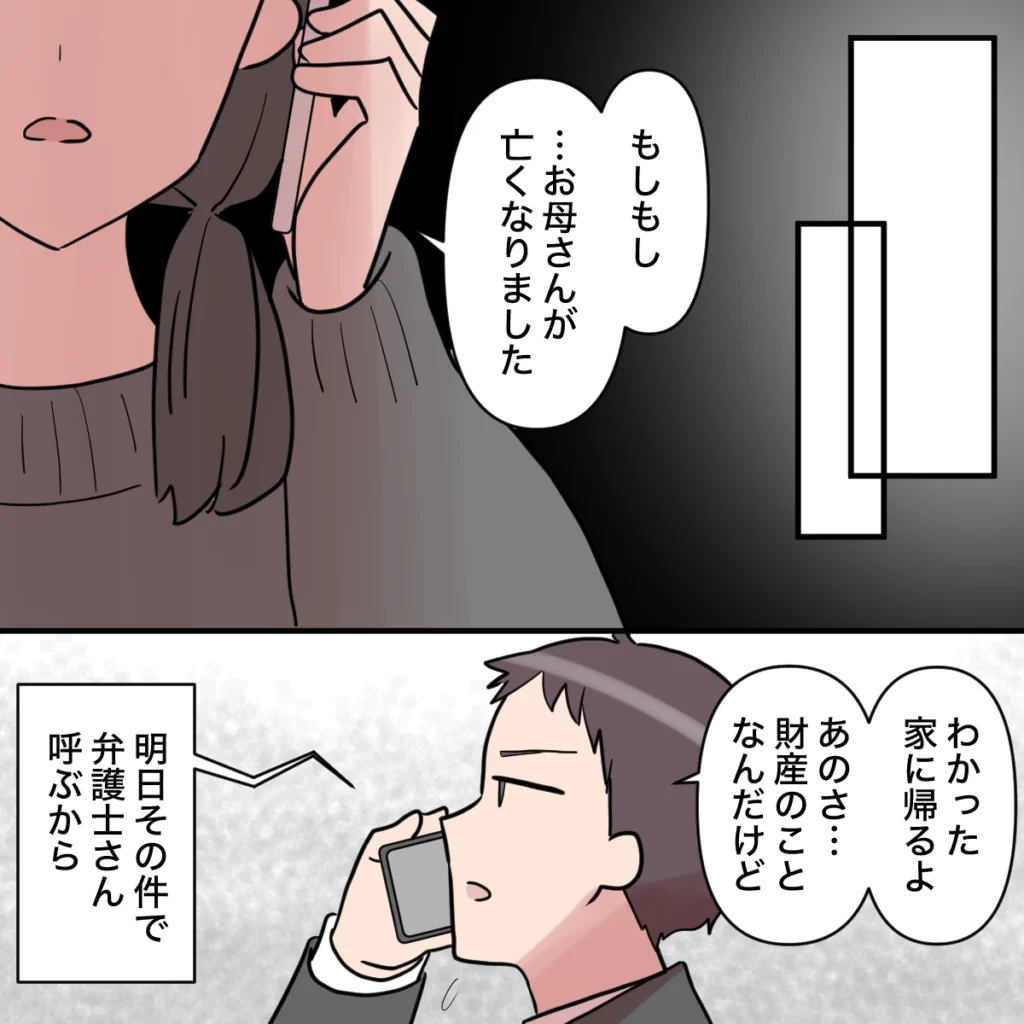 それから数年後、お母さんが亡くなりました。そのことを渉に伝えると、彼は悲しむ素振りも見せず「わかった家に帰るよ、あのさ・・・財産のことなんだけど」と切り出します。母親を亡くしたにもかかわらず、真っ先に気にするのは財産のこと。元妻ながら、あまりにも卑しい態度に呆れてしまいました。