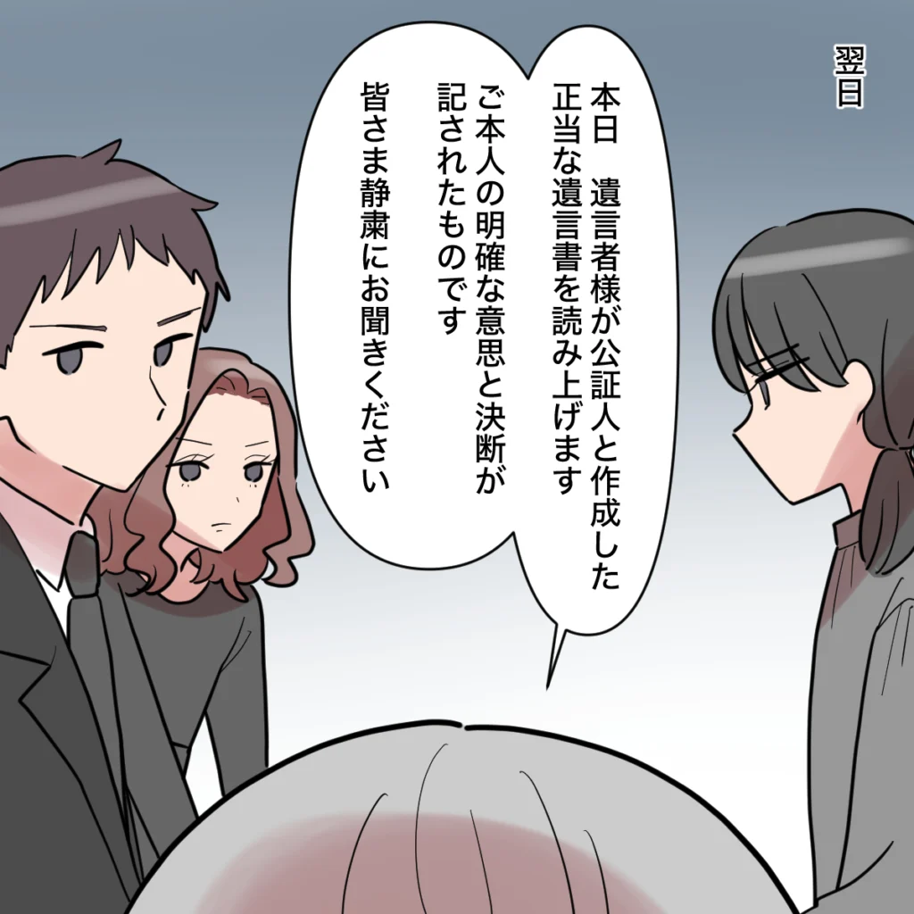 その翌日。私は自宅に弁護士と渉たちを呼び、お母さんが遺した遺言書を開封しました。「本日、遺言者様が公証人と作成した正当な遺言書を読み上げます、ご本人の明確な意思と決断が記されたものです」弁護士の言葉に、渉と祥子さんは固唾をのんで耳を傾けます。