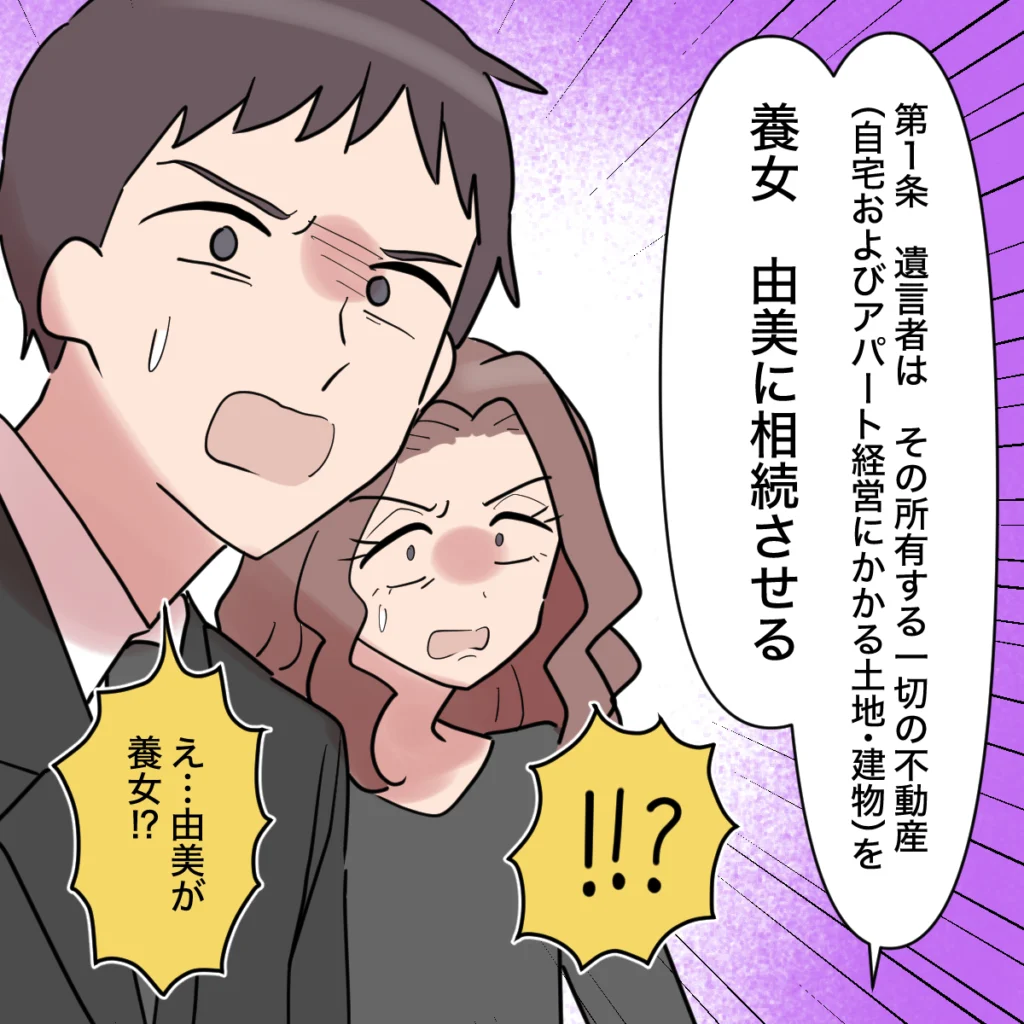 しかし、遺言書の内容は、渉たちが思い描いていたものとはまったく違っていました。お母さんは所有する全ての不動産を、養女である私に相続させると明記していたのです。「え・・・由美が養女!?」その事実を知った渉と祥子さんは、ひどく驚いた表情を見せました。