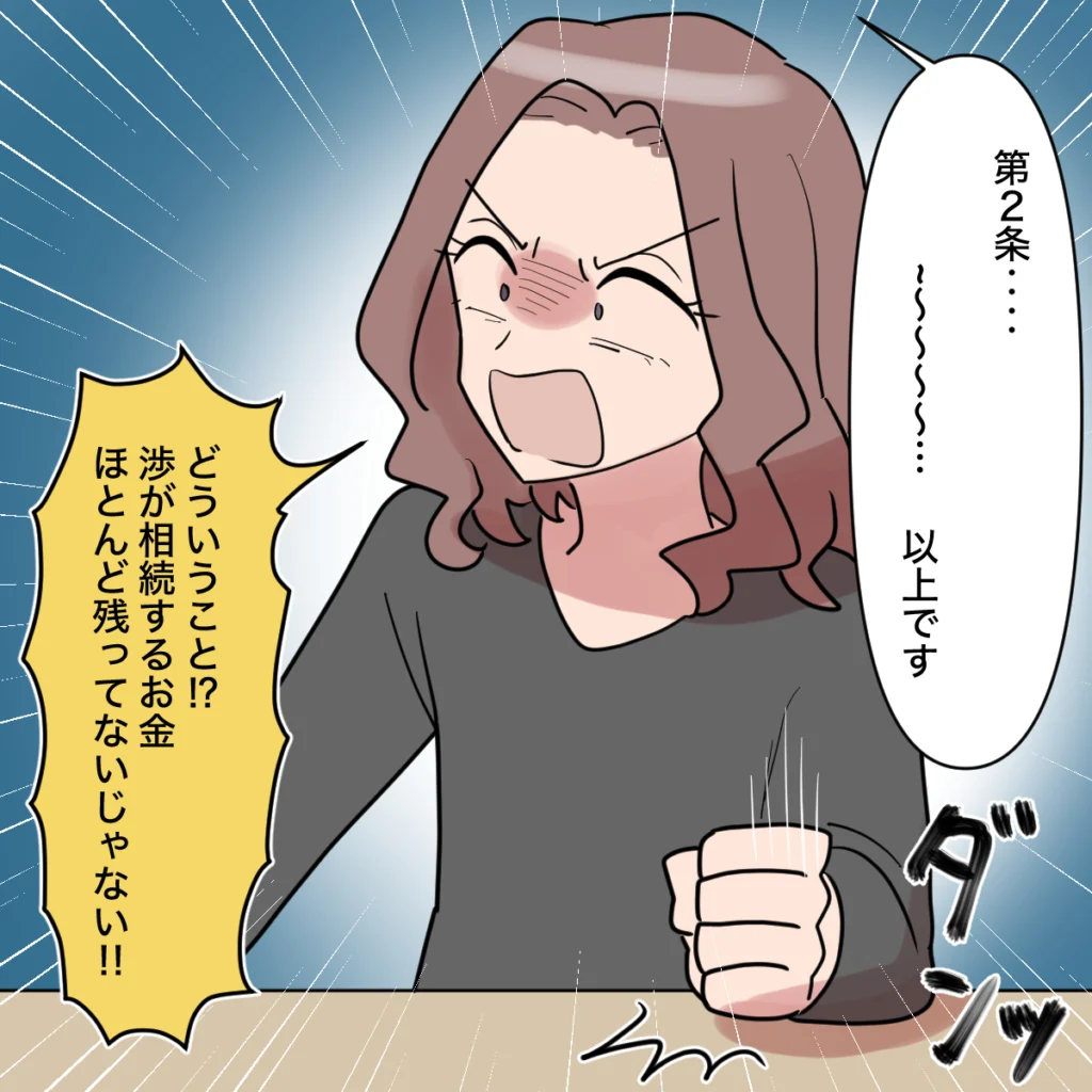お母さんは生前、手元の現金をアパート経営用の土地や建物へと換えていました。そのため、渉が相続できる現金はほとんど残っていなかったのです。莫大な財産が手に入ると信じていた祥子さんは机を強く叩き、「どういうこと!?渉が相続するお金、ほとんど残ってないじゃない!」と怒りをあらわにします。