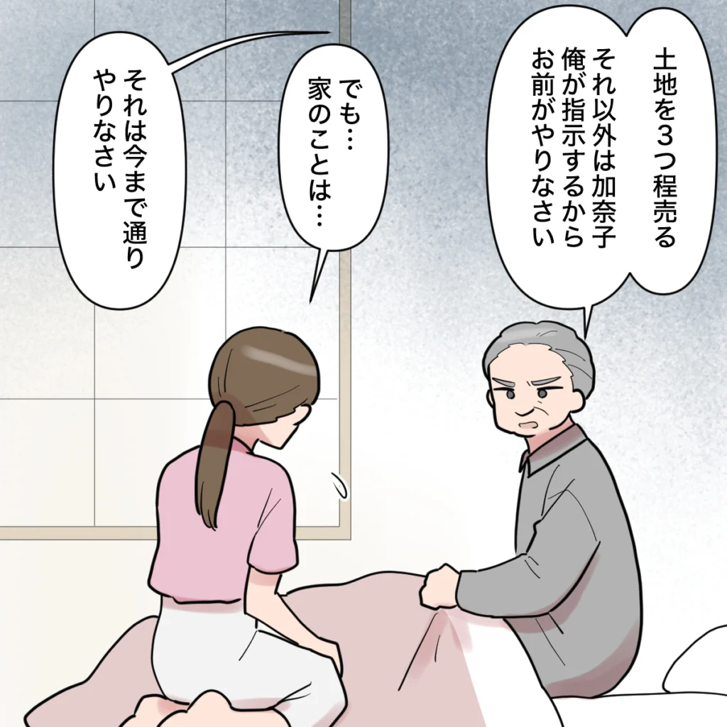 ある日、「土地を3つ程売る。それ以外は加奈子、俺が指示するからお前がやりなさい」と義父から唐突に言われました。自分が動けなくなり、省吾さんがいないのならば嫁の私にやらせようということなのでしょう。「でも・・家のことは・・」と戸惑う私に、義父は「それは今まで通りやりなさい」と冷たく言い放ちました。