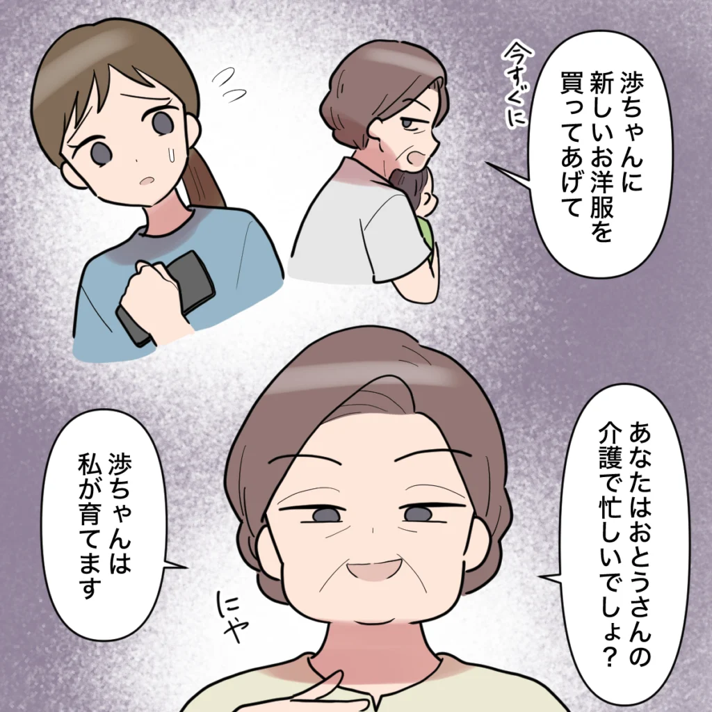 その後、私はこれまでの家事と介護に加えて仕事もしなくてはいけなくなり毎日目の回るような忙しさでした。そんな状況でも義母はお構いなしに「渉ちゃんに新しいお洋服を買ってあげて。今すぐに」と私に用事を言いつけ、「あなたはお父さんの介護で忙しいでしょ?渉ちゃんは私が育てます」と勝ち誇ったように言いました。