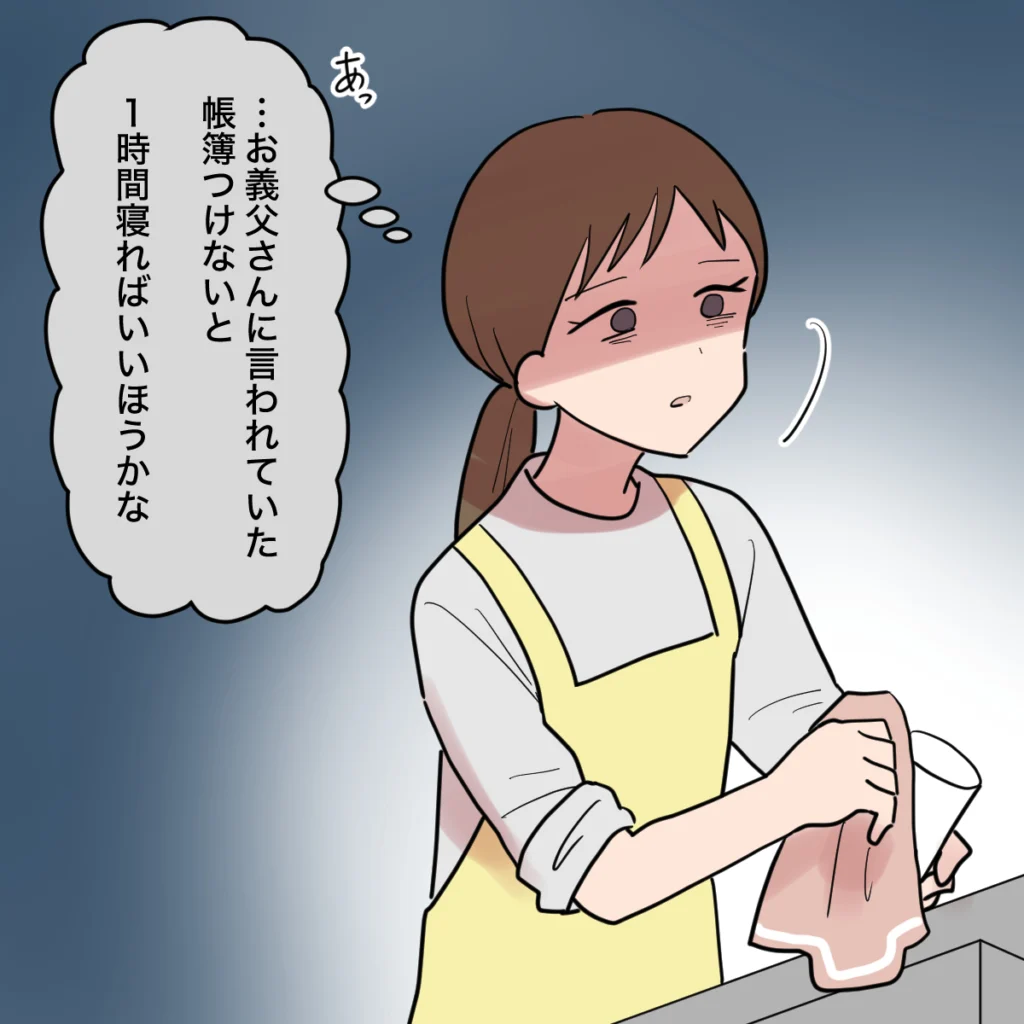 慣れない仕事でクタクタでも義母が家事を助けてくれることはありません。深夜、残っていた洗い物をしながら「あっ・・お義父さんに言われていた帳簿つけないと」と思い出した私は「1時間寝ればいいほうかな」と考えながらただただ目の前の家事を必死に片付けました。やってもやっても次から次へとやらないといけないことが出てきて終わりません。私はまともに寝ることさえできませんでした。