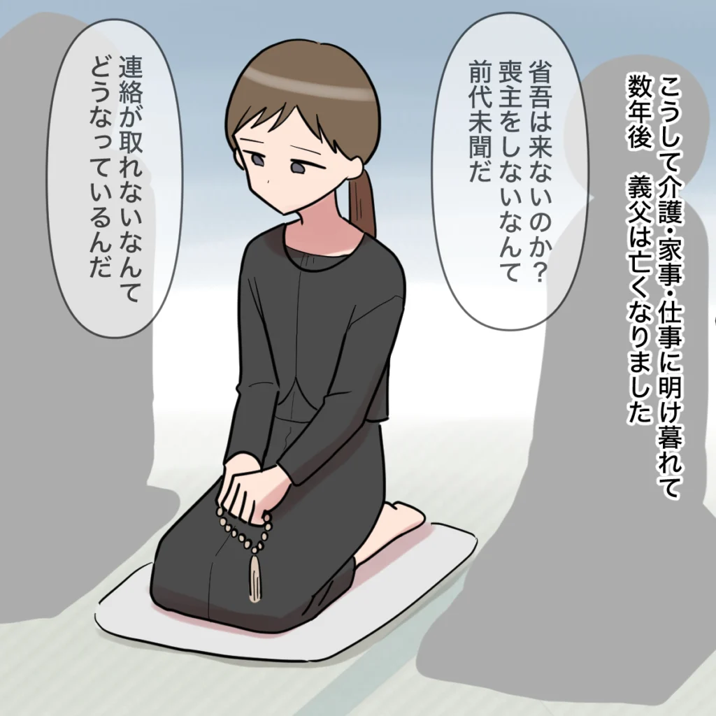 こうして介護、家事、仕事に明け暮れて数年が経った頃、義父は亡くなりました。もちろん義父の葬儀にも省吾さんの姿はありません。連絡しようにも、どこにいるのかも分からないのですからどうしようもありません。葬儀中、親戚たちが「省吾は来ないのか?喪主をしないなんて前代未聞だ」「連絡が取れないなんてどうなっているんだ」と口々に言っていましたが、私はただ黙って座っていました。