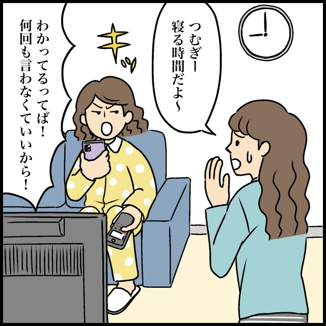 平日の夜9時。スマホ片手にテレビを見ている娘のつむぎに「そろそろ寝る時間だよ~」と声をかけました。「わかったー」と返事はするものの、なかなか寝ようとしないつむぎ。しばらくしてもう一度声をかけると、私をキッと睨みつけながら「わかってるってば!何回も言わなくていいから!」と怒りだしました。