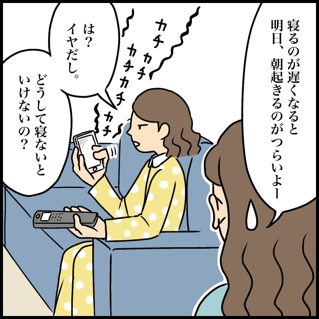 「寝るのが遅くなると明日起きるのがつらいよー」翌朝眠くて不機嫌なつむぎの様子がありありと想像できる私はそう声をかけますが、つむぎはスマホに目を向けたまま「は?イヤだし。どうして寝ないといけないの?」と反抗します。