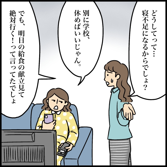 寝る理由を聞かれ「どうしてって・・寝不足になるからでしょ?」と答えると、「別に学校、休めばいいじゃん」とめちゃくちゃなことを言うつむぎ。どうにかしてつむぎに寝ようと思ってもらいたい私は「でも、明日の給食の献立見て絶対行く!って言ってたでしょ」と明日が楽しみになるような声かけをしてみましたが効果なし。