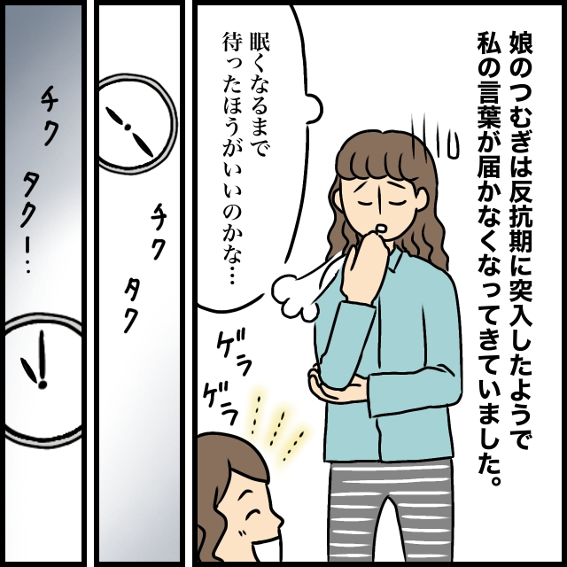 つむぎは反抗期に突入したようで、私の言葉が届かなくなってきていました。今は何を言っても反抗して逆効果かもしれない。もう少しテレビを見たら気が済むかもしれないし・・。「眠くなるまで待ったほうがいいのかな」そう思った私はしばらく様子を見ることにしました。しかし・・それから1時間以上経っても、つむぎはゲラゲラ笑いながらテレビを見ていて寝る気配なし。