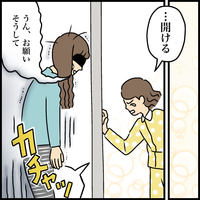 「怒らない」という私の言葉をなかなか信じてくれなかったつむぎでしたが、ようやく「・・開ける」と言ってくれました。私が「うん、お願い。そうして」と疲れ切った声で返すと、カチャッと鍵が開く音がしました。ドアの向こうには泣きべそのつむぎ。