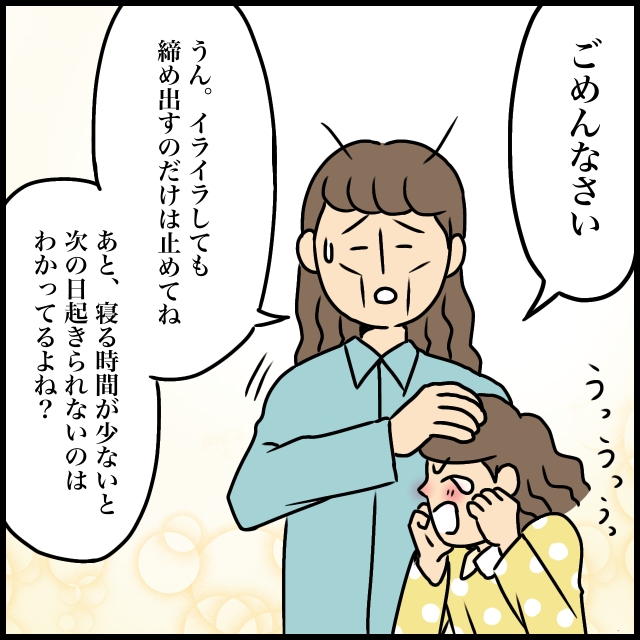 つむぎは私の顔を見ると「ごめんなさい」と謝り泣きじゃくりました。数時間の締め出しを食らった私は疲労困憊でげっそりしながら「うん。イライラしても閉め出すのだけはやめてね。あと、寝る時間が少ないと次の日起きられないのはわかってるよね?」と諭すように言いました。