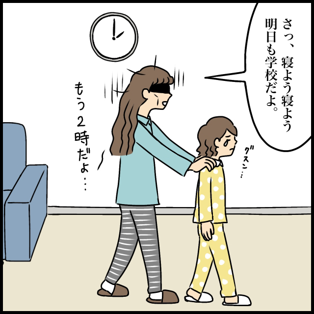 怒らないと約束はしたけれど、そんな約束がなくてももはや怒る気力など微塵も湧いてきません。一刻も早くつむぎを寝かせ、私もさっさと寝たい!「さっ、寝よう寝よう。明日も学校だよ」と泣きべそのつむぎを寝室に促しながらちらっと時計を見ると、もう2時になっていました・・。
