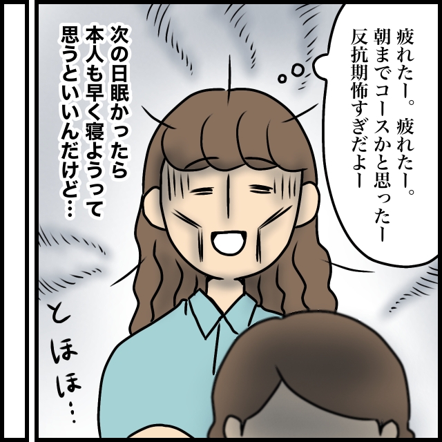 つむぎと寝室に向かう私は「疲れたー。疲れたー。朝までコースかと思ったー。反抗期怖すぎだよー」と心の中で呟きつつ「次の日眠かったら本人も早く寝ようって思うといいんだけど・・」とうっすら期待していました。
