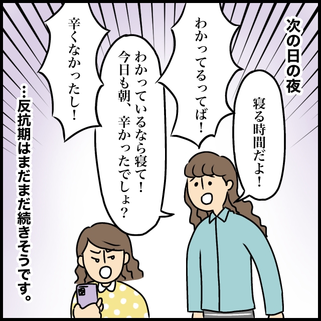 そして次の日の夜。「寝る時間だよ!」と言う私に「わかってるってば!」と声を荒げつつも一向に寝ようとしないつむぎ。「わかっているなら寝て!今日も朝、辛かったでしょ?」と言っても「辛くなかったし!」と強がります。はぁ・・またか・・。昨日の一件で少しはわかってくれたかなと思っていましたが・・そんなに甘くはないようです。つむぎの反抗期はまだまだ続きそうです。