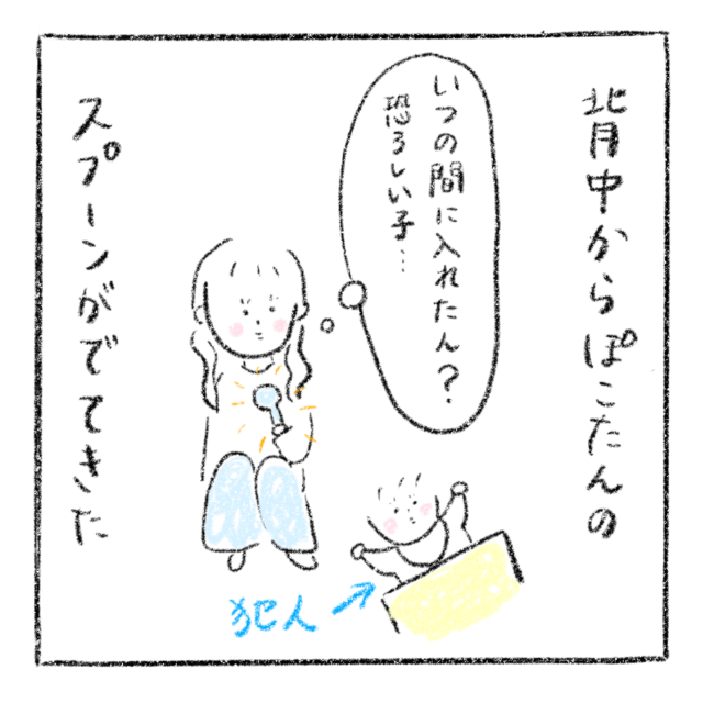 ソファやシンクでおもちゃが見つかることはよくあるのですが、自分の服の中からスプーンが出てきたときは驚きました。