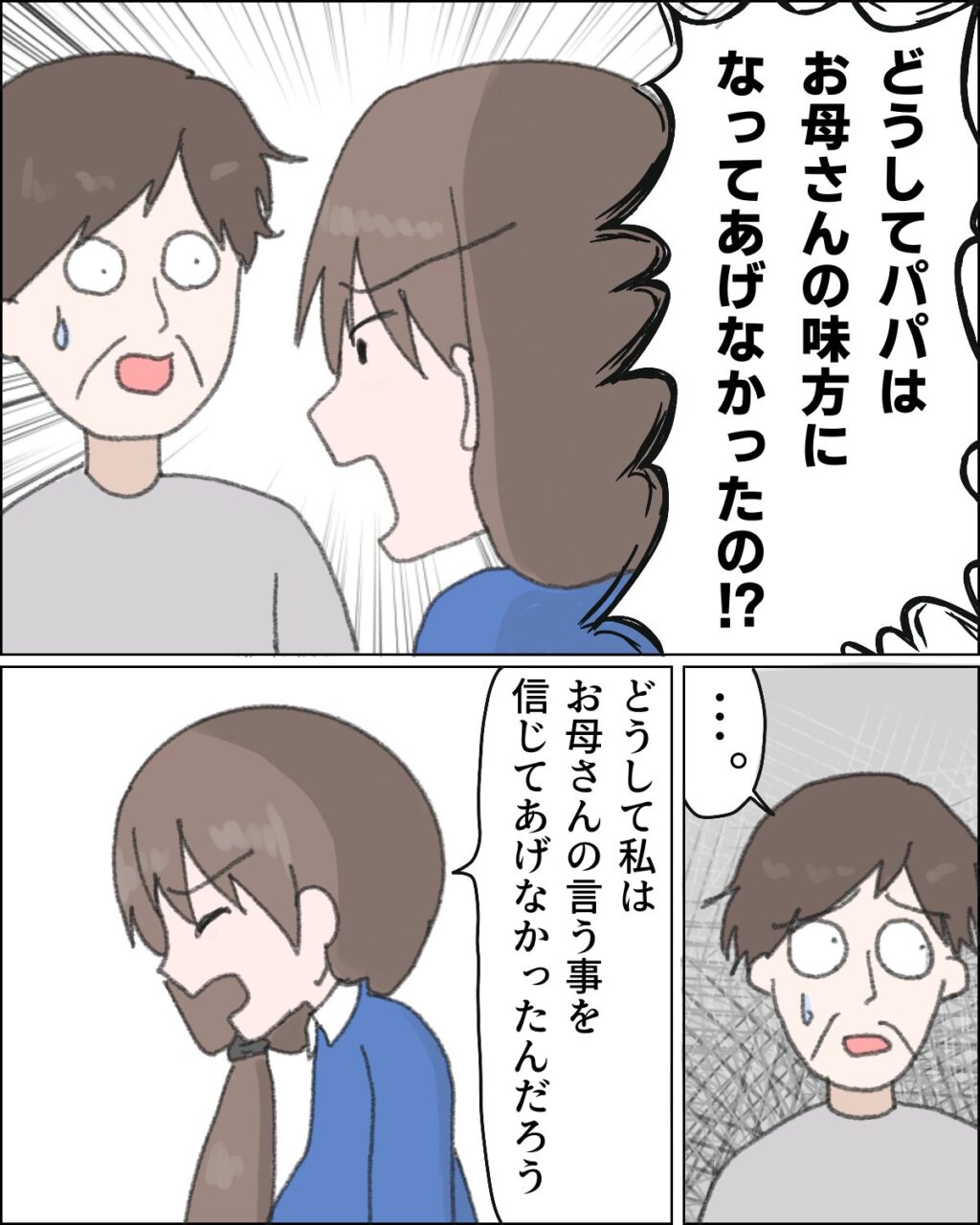 「どうしてパパはお母さんの味方になってあげなかったの!?」と責めると、パパは気まずそうに視線を逸らし何も答えません。「どうして私はお母さんの言う事を信じてあげなかったんだろう」激しい後悔の念が押し寄せます。