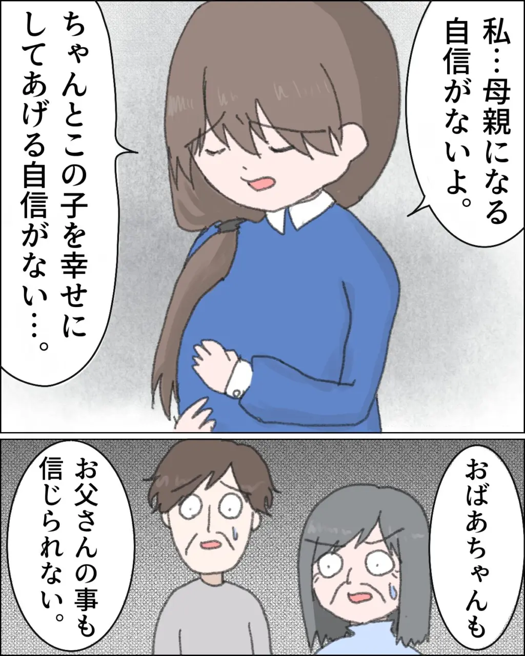 「私・・母親になる自信がないよ。ちゃんとこの子を幸せにしてあげる自信がない・・。おばあちゃんもパパの事も信じられない」私がそう呟くと、二人は気まずそうに立ち尽くします。
