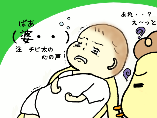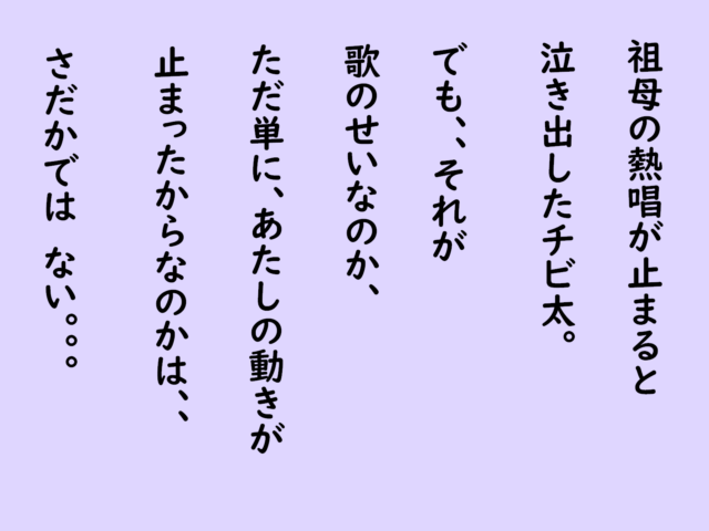 深夜、祖母てる子さんと孫チビ太くんの戦いの火ぶたが切られました。覚醒したチビ太くんを寝かせるため、てる子さんは歌い始めます。まずは童謡から始まり、乗ってきたてる子さんは90年代バンド曲に突入、最終的に自分の子どもの頃のアニメソングに到達します。真夜中に新生児のチビ太くんに祖母チョイスのメドレーを延々と披露するてる子さんなのでした。