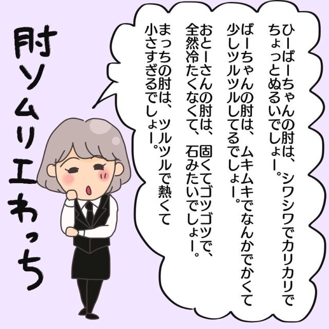 今回は、長女わっちちゃんが寝るときに欠かせない「肘」のお話です。いつもねこじまいもみさんの肘を触りながら眠るというわっちちゃん。たくさんの人の肘を触ってきたわっちちゃんの肘レビューはまるでソムリエ!