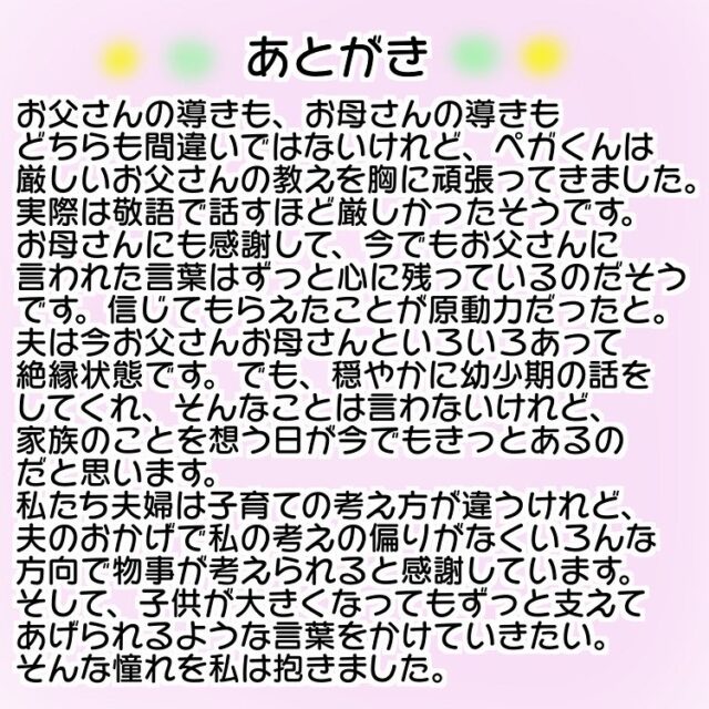 ペガくんの子どもの頃の話を聞いた長男くんはどんなことを感じたのでしょう?ペガくんがそうだったように、長男くんも前向きになるきっかけを見つけられているといいですね!
