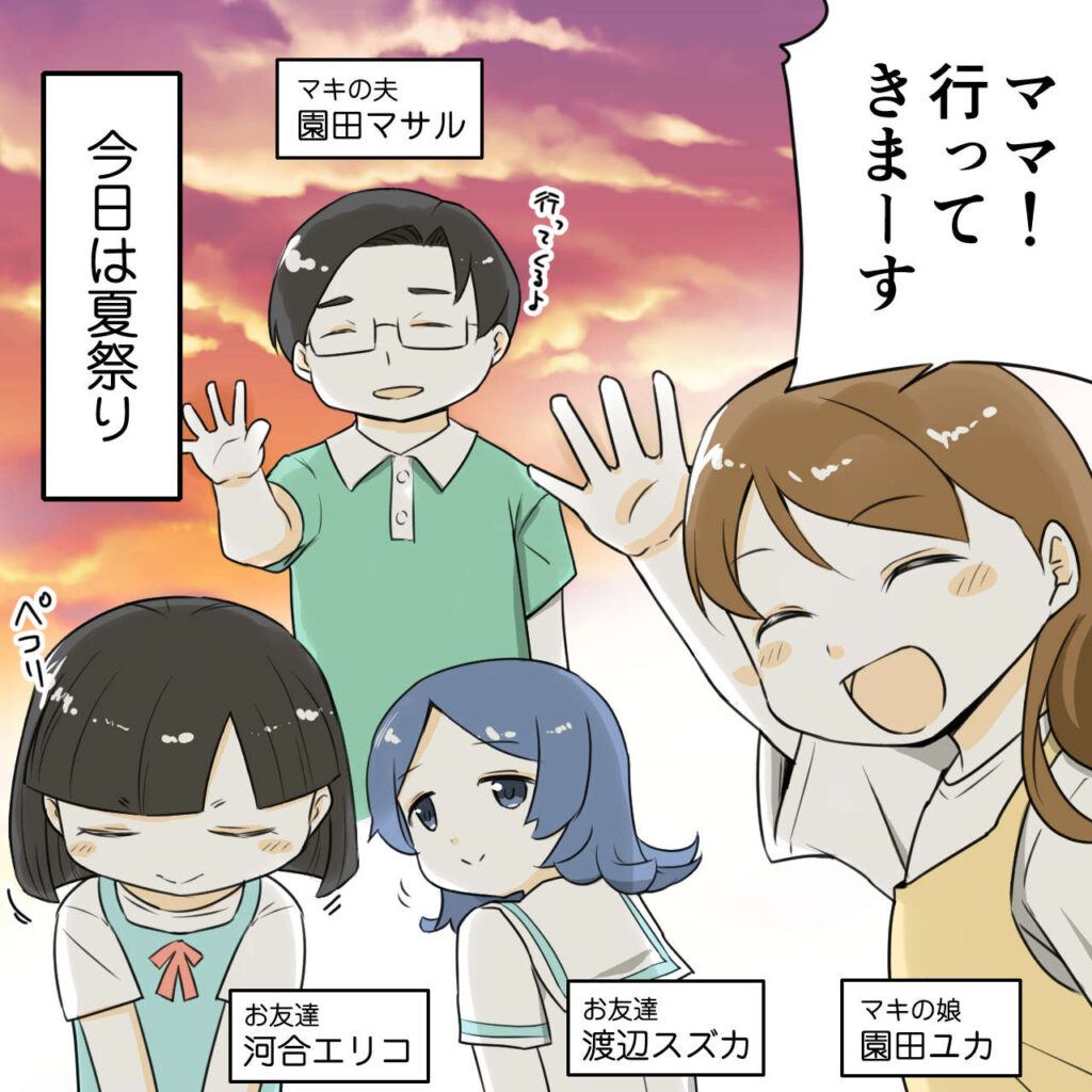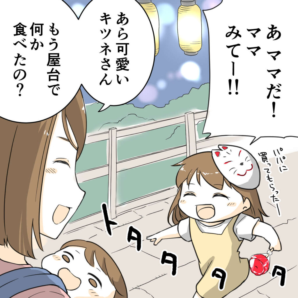 そして夏祭りの場所へ行くと、「あ、ママだ!みてー!!」そう言って、キツネのお面を見せ、「あら可愛いキツネさん。もう屋台で何か食べたの?」と聞くと、