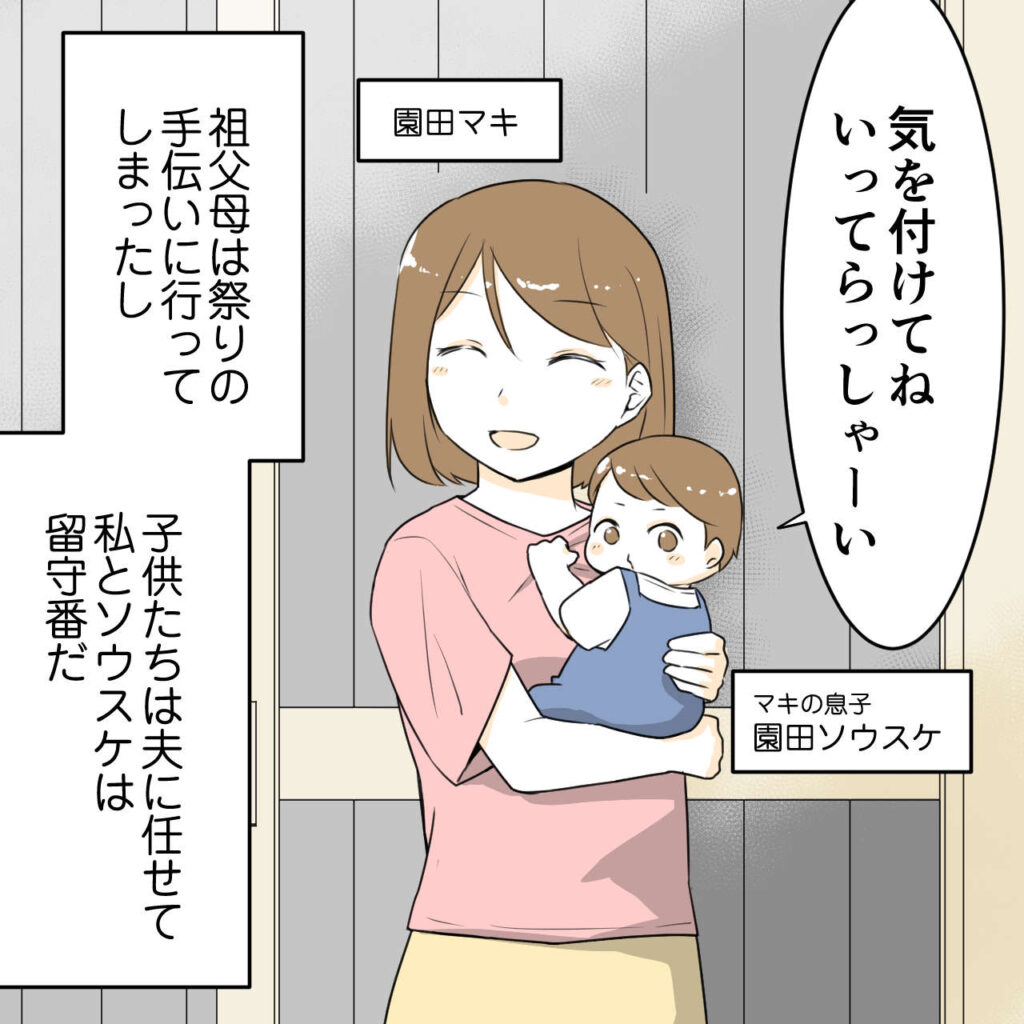 祖父母は祭りの手伝いに行ってしまったし、子どもたちは夫に任せて、私とソウスケで留守番することになりました。