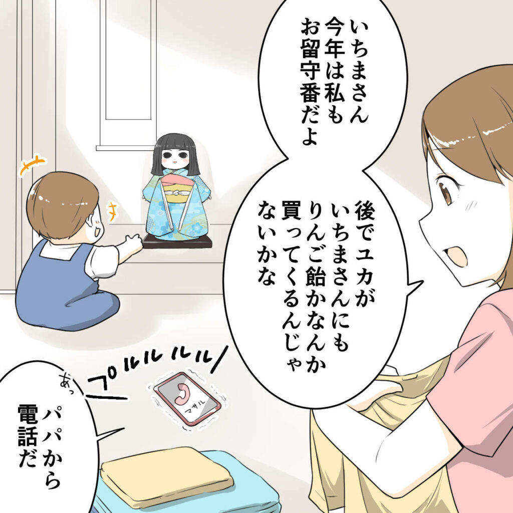 そして、「いちまさん、今年は私もお留守番だよ。後でユカが、いちまさんにもりんご飴なんか買ってくるんじゃないかな」といちまさんに話しかけると、ソウスケも近くで何やら話している様子。すると、夫から電話がかかってきました。