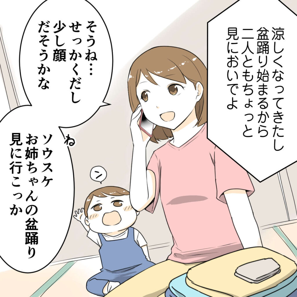 「涼しくなってきたし、盆踊り始まるから、二人ともちょっと見においでよ」そう言われて、「そうね・・せっかくだし少し顔出そうかな」と夫に言った後、「ね、ソウスケ、お姉ちゃんの盆踊り見に行こっか」ソウスケにたずねると、「ン」と手をあげて答えました。