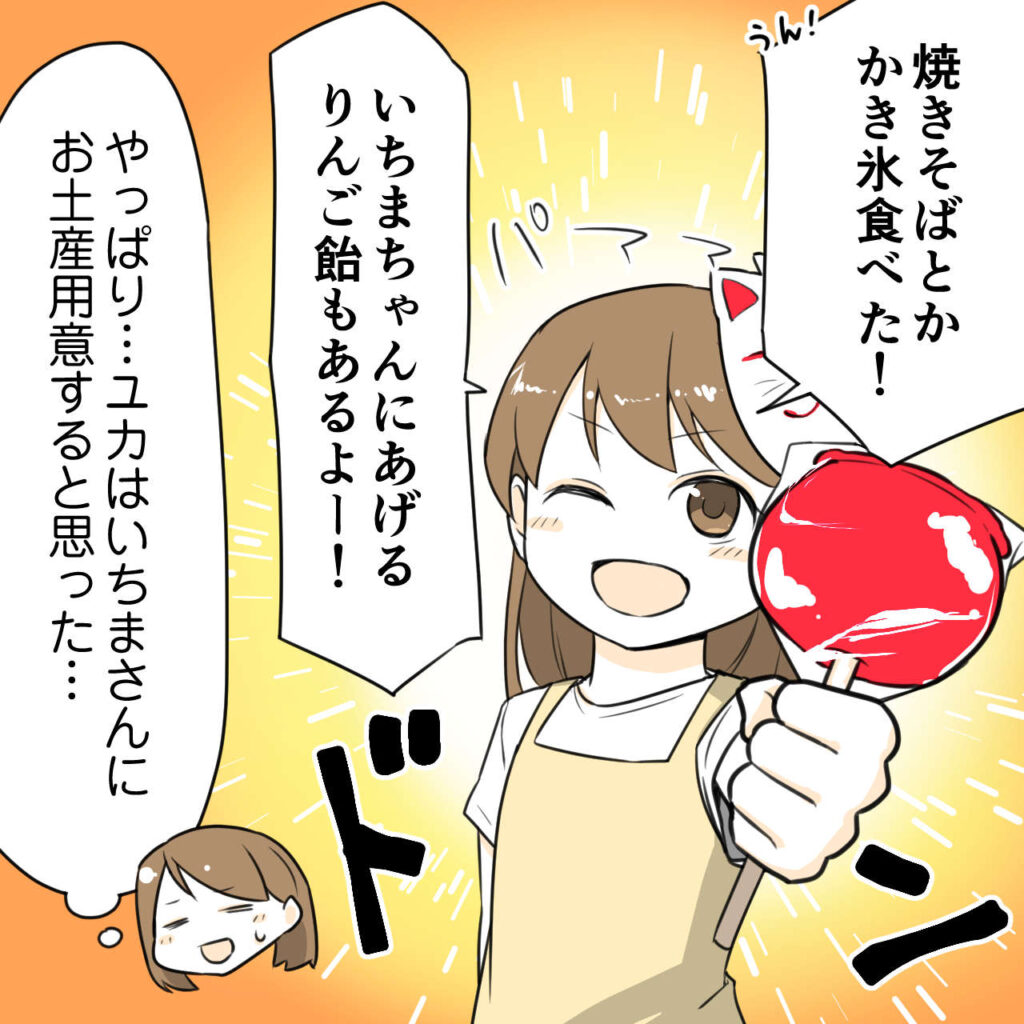 「うん!焼きそばとか、かき氷食べた!いちまちゃんにあげるりんご飴もあるよー!」とドンっと差し出すユカを見て、「やっぱり・・ユカはいちまさんにお土産用意すると思った・・」と思わず笑顔になりました。